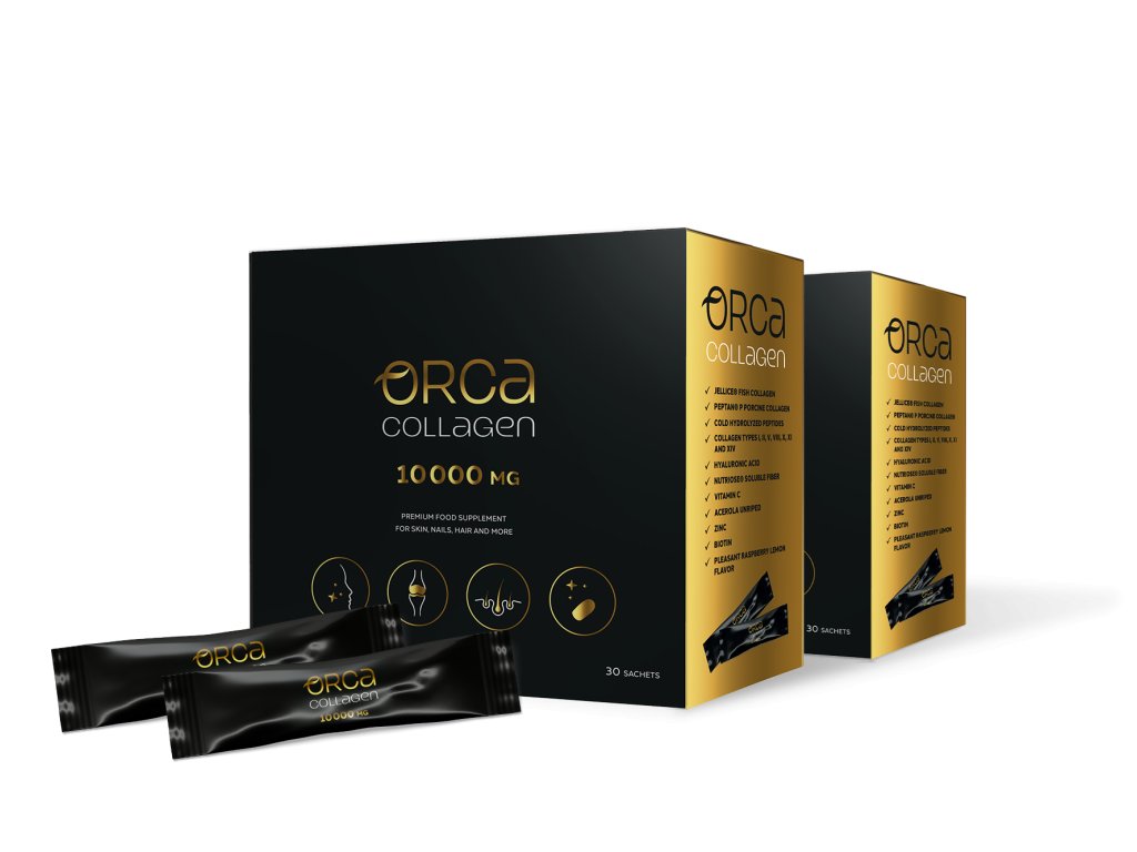 Orca Collagen je prémiový doplněk stravy pro péči o vaši pleť. Výborných účinků dosahuje také v oblasti regenerace vlasů, nehtů a kloubů. Obsahuje 6000 mg peptidů za studena hydrolyzovaného rybího kolagenu značky Jellice® z divoce žijících ryb Severního moře a 2000 mg peptidů hydrolyzovaného vepřového kolagenu značky Peptan P®, které se skládají z kolagenu I., II., V., VIII., X., XI., XIV. typu a také speciálního enzymu GTPázy, který napomáhá transportu informací do buněk. A dále také: